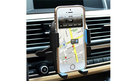 AML Designs creates hands-free device holders that easily attach to your vents and keeps your phone near the top of your dash for easy reading.